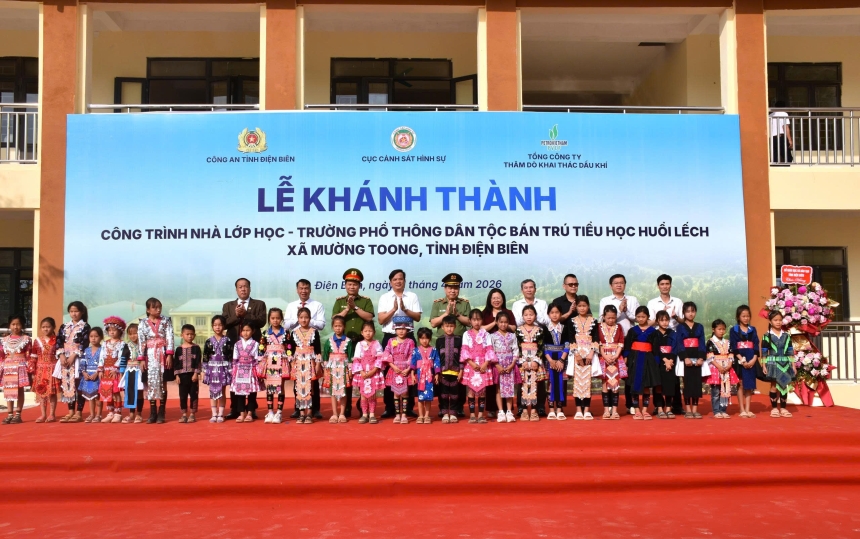 Ngày 11/4/2026, tại xã Mường Toong, tỉnh Điện Biên đã diễn ra Lễ khánh thành Trường Phổ thông Dân tộc Bán trú Tiểu học Huổi Lếch – một công trình có ý nghĩa thiết thực đối với sự nghiệp giáo dục tại địa phương. Công trình gồm 6 phòng học đạt tiêu chuẩn, được xây dựng trên diện tích 500m², do Tổng công ty Thăm dò Khai thác Dầu khí (PVEP) tài trợ, phối hợp với Công an tỉnh Điện Biên là chủ đầu tư tổ chức triển khai, trên cơ sở kết nối, vận động của Cục Cảnh sát Hình sự (C02), Bộ Công an.