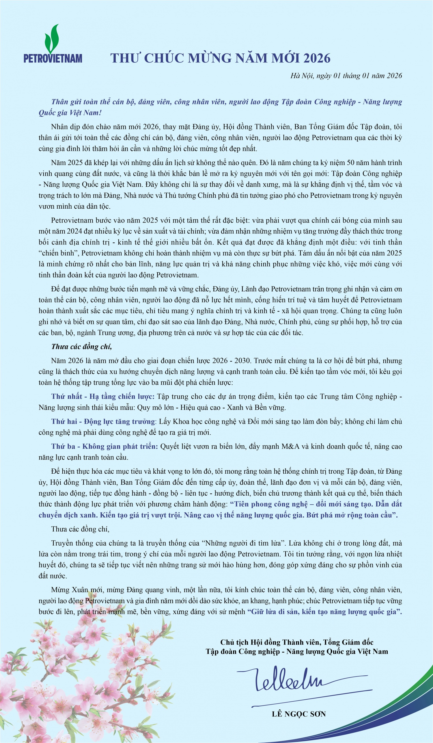 Nhân dịp đón chào năm mới 2026, Chủ tịch HĐTV, Tổng Giám đốc Tập đoàn Công nghiệp - Năng lượng Quốc gia Việt Nam (Petrovietnam) Lê Ngọc Sơn đã có thư chúc mừng gửi tới toàn thể cán bộ, đảng viên, công nhân viên, người lao động Petrovietnam qua các thời kỳ cùng gia đình.