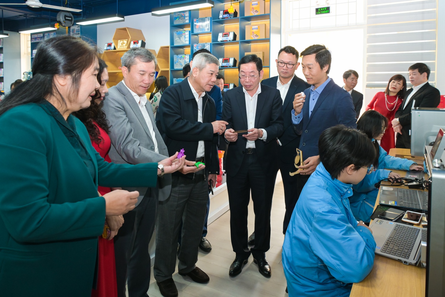 Các đại biểu tham quan các sản phẩm do các em học sinh chế tác từ phòng thực hành giáo dục STEM.
