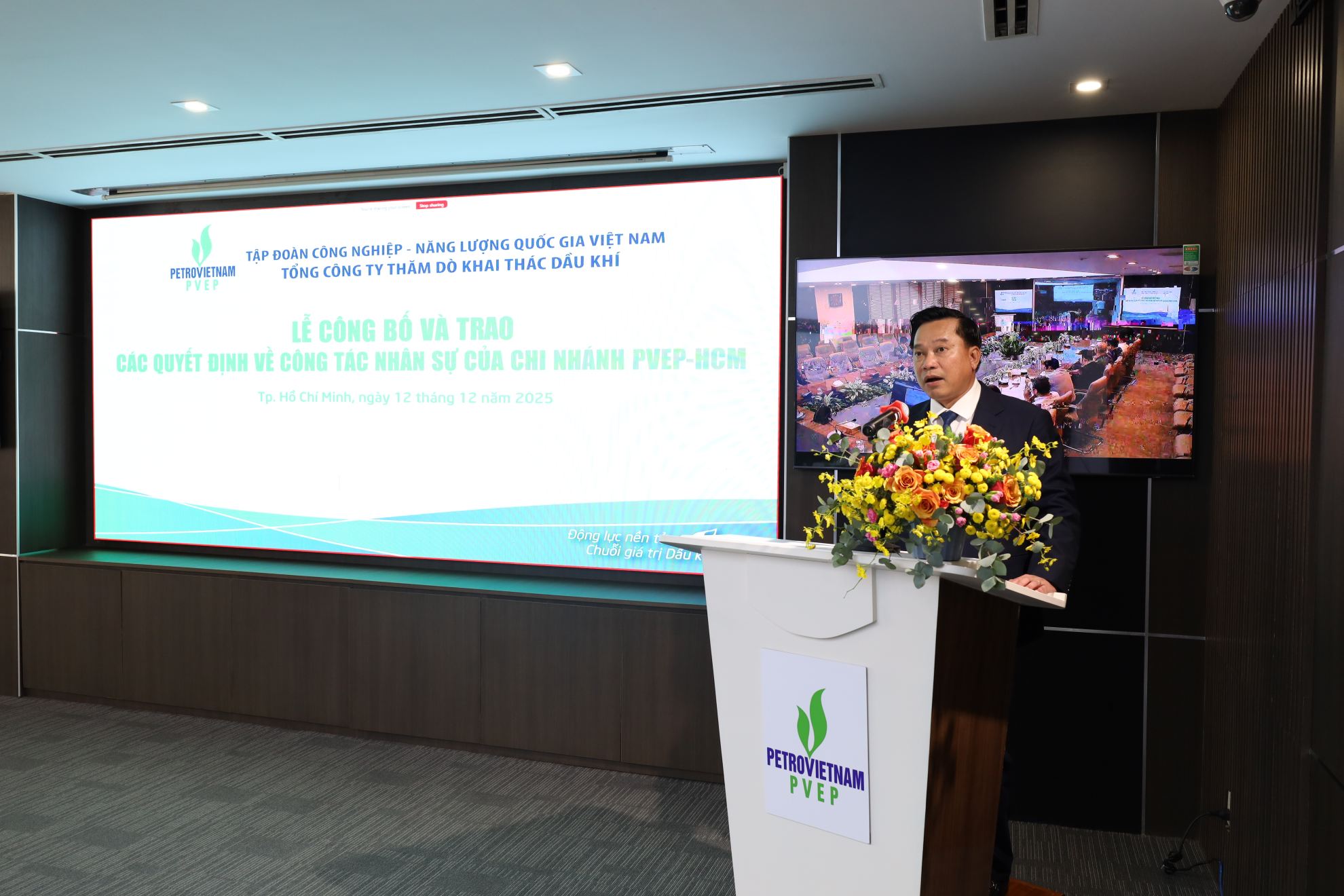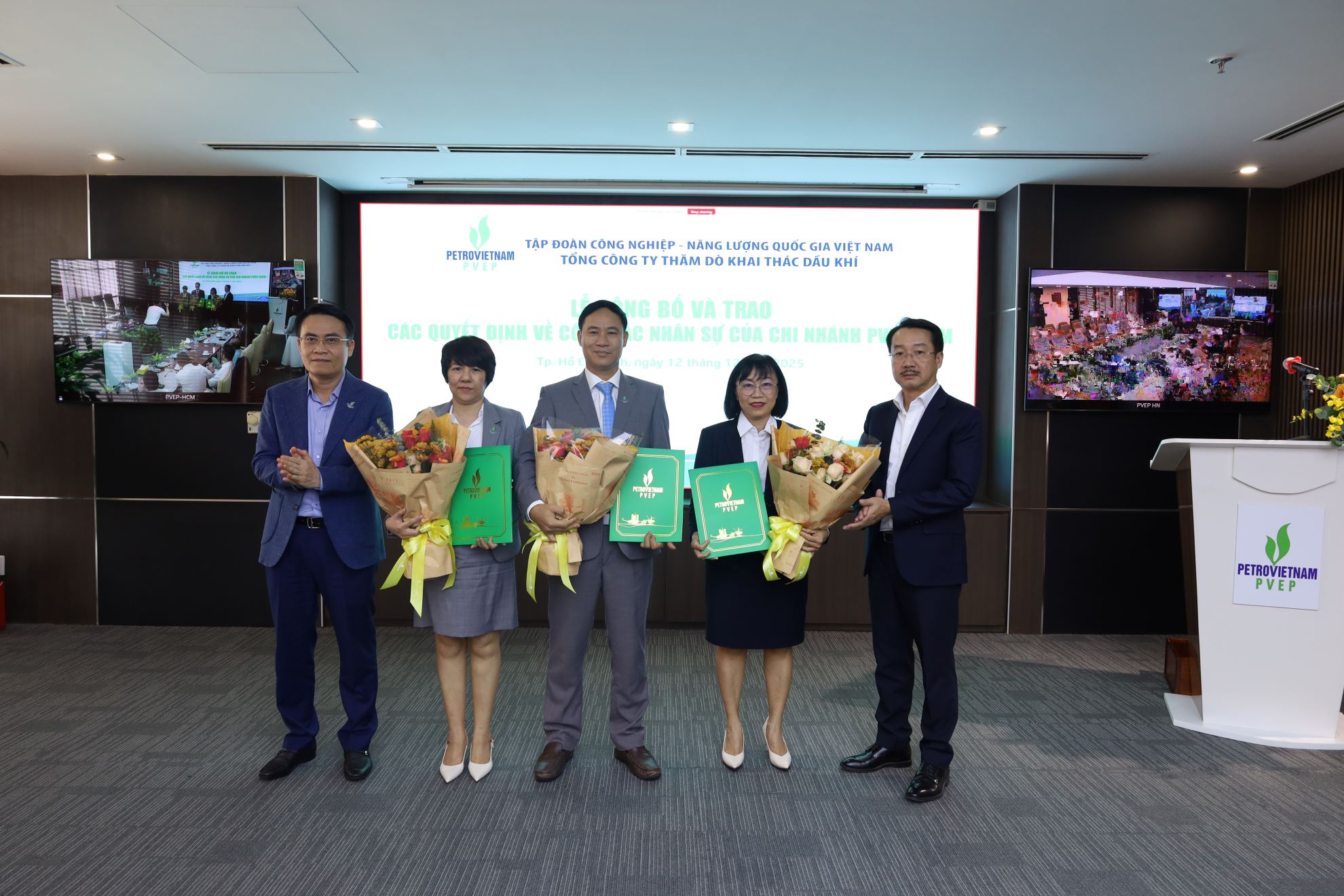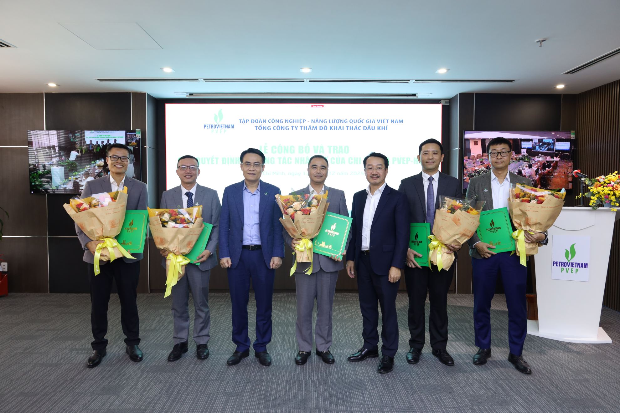 Ngày 12/12/2025, Tổng Công ty Thăm dò Khai thác Dầu khí (PVEP) đã trang trọng tổ chức Lễ công bố các Quyết định về công tác cán bộ của Chi nhánh PVEP-HCM. Sự kiện có ý nghĩa quan trọng, đánh dấu bước hoàn thiện cơ cấu tổ chức của Chi nhánh trong bối cảnh PVEP tổ chức lại mô hình quản lý nhằm tiếp nhận, triển khai và vận hành đồng thời hai dự án dầu khí trọng điểm là Dự án Lô 01/10&02/10 và Dự án Lô 01/97&02/97.