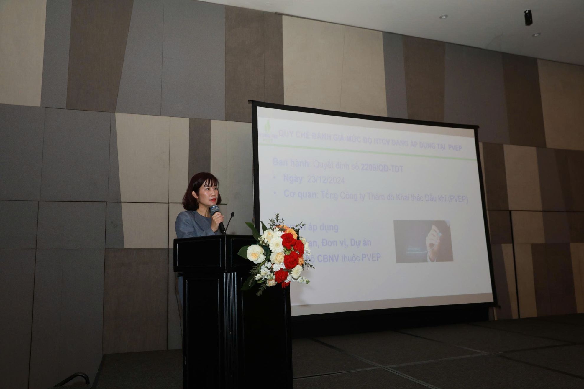Tại hội thảo, bà Đỗ Thái Hằng - Trưởng ban Quản trị Nguồn nhân lực đã trình bày tham luận về quá trình nghiên cứu và xây dựng đề tài. Theo đó, đề tài được triển khai từ yêu cầu tiếp tục hoàn thiện công tác đánh giá mức độ hoàn thành công việc tại PVEP trên cơ sở hệ thống giao việc đã và đang được vận hành trên nền tảng 1-Office. Qua quá trình nghiên cứu, rà soát và thử nghiệm nhiều phương án, nhóm thực hiện đã lựa chọn cách tiếp cận đánh giá theo mục tiêu, với nguyên tắc xác định rõ mục tiêu, thống nhất hai chiều giữa người giao việc và người thực hiện, đo lường kết quả theo mức độ hoàn thành, đồng thời tăng tính tự chủ và trách nhiệm trong công việc. Đề tài hướng tới các mục tiêu như nâng cao hiệu quả, cải thiện hiệu suất, ghi nhận kịp thời đóng góp của cán bộ nhân viên, chuẩn hóa công tác giao việc và đánh giá, tối ưu nguồn lực và thúc đẩy chuyển đổi số trong quản trị nhân sự.