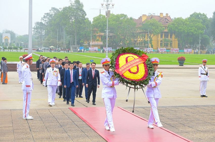 Các đại biểu dâng hoa bày tỏ lòng thành kính trước anh linh Chủ tịch Hồ Chí Minh vĩ đại.