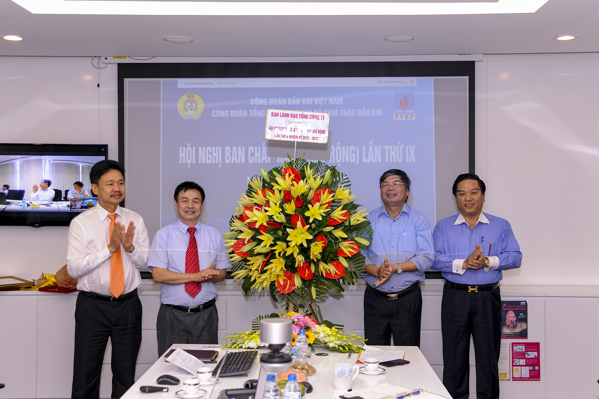 Chủ tịch Hoàng Ngọc Đang và Tổng Giám đốc Ngô Hữu Hải tặng hoa chúc mừng Công đoàn PVEP nhân kỷ niệm 86 năm ngày thành lập Công đoàn Việt Nam