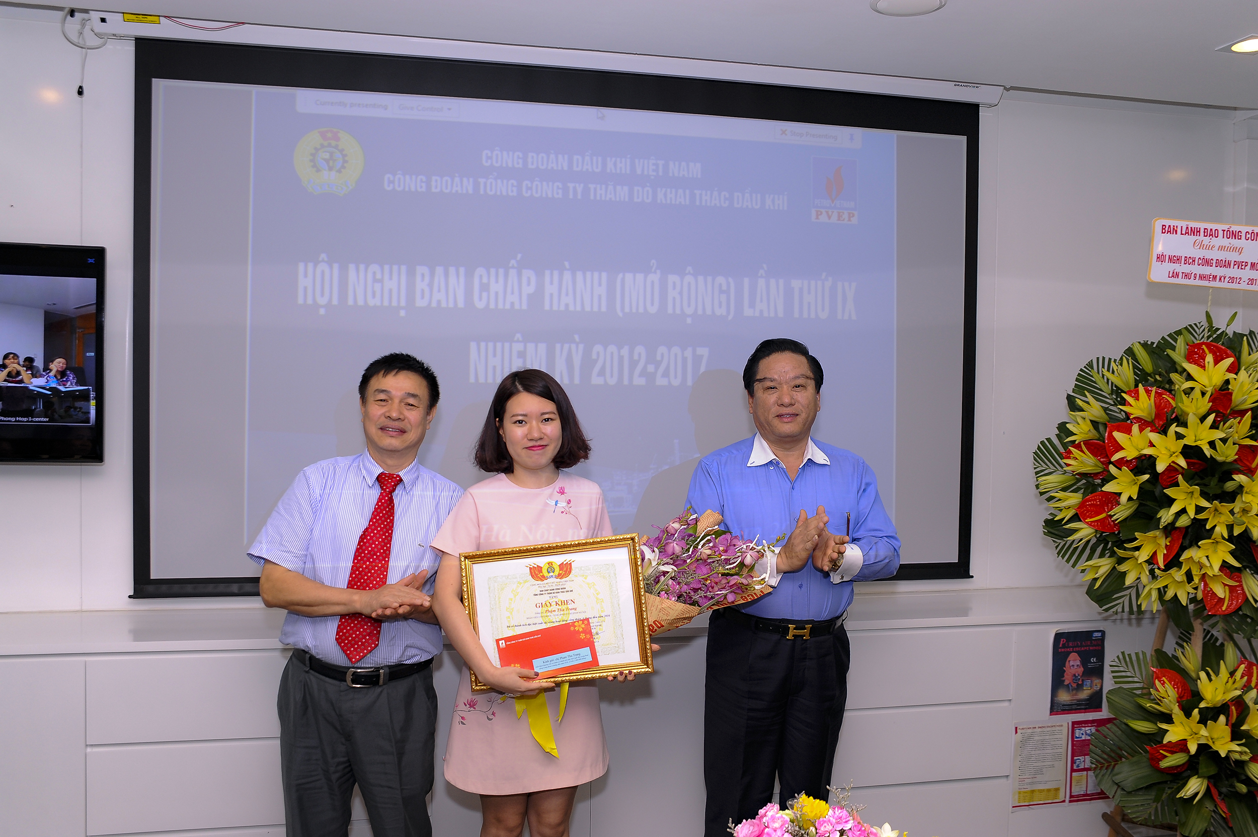 Tổng Giám đốc Ngô Hữu Hải và Chủ tịch Công đoàn Nguyễn Văn Cư tặng hoa và bằng khen cho Chị Phạm Thu Trang – Chuyên viên Ban Thương mại, cá nhân đã có những hoạt động tích cực cho hoạt động của Công đoàn Tổng Công ty 06 tháng đầu năm.